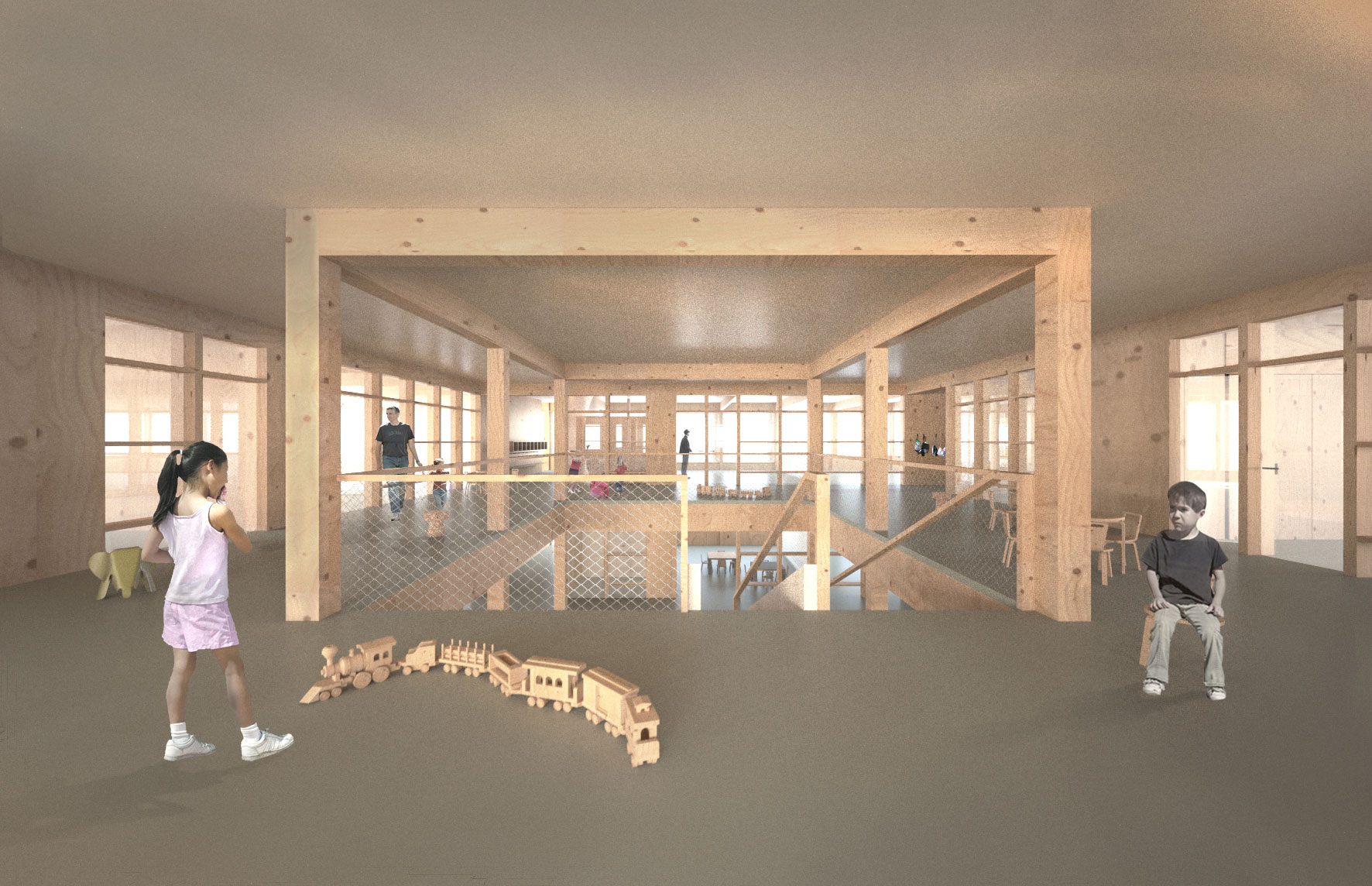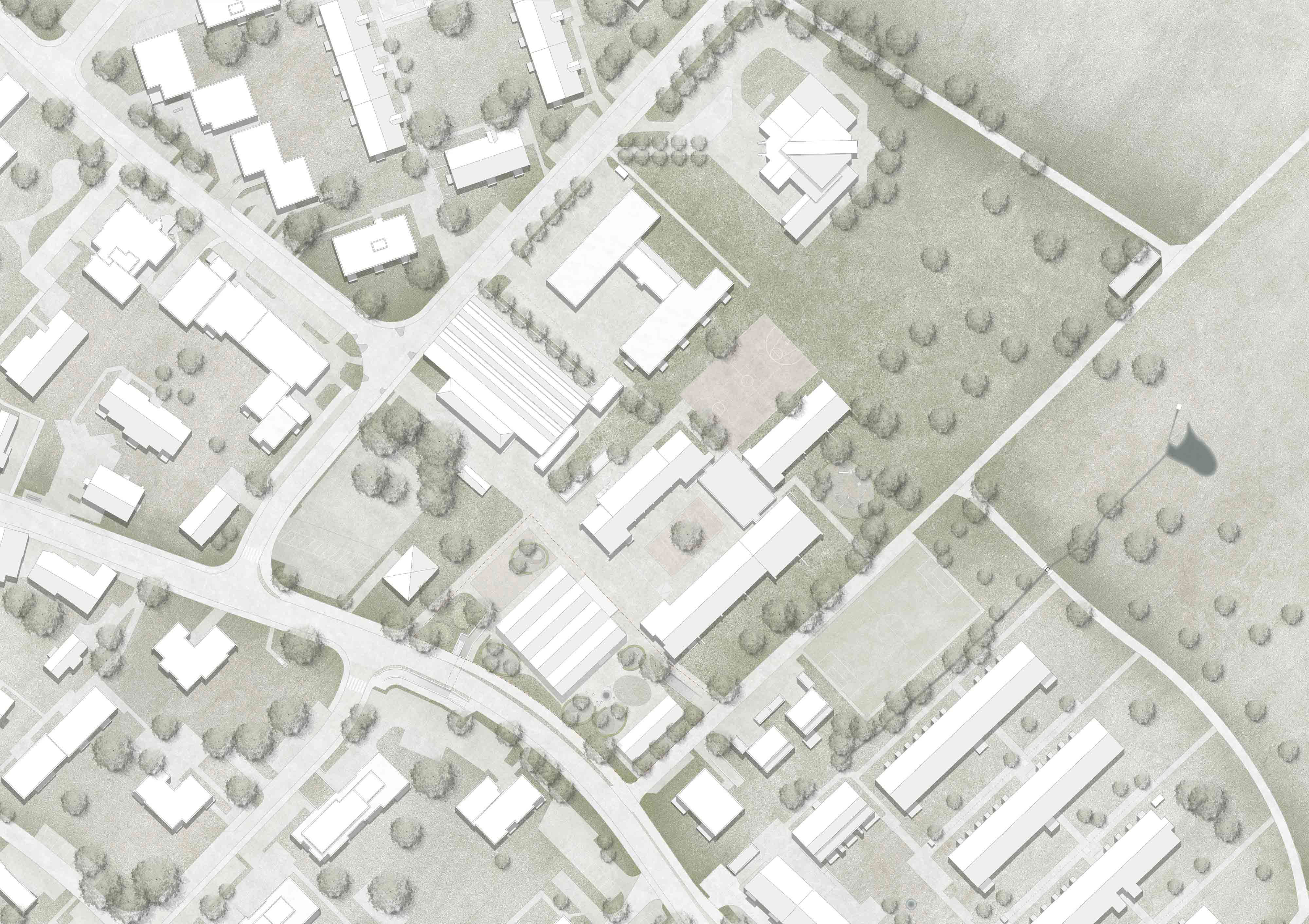 Der Neubau versteht sich als städtebaulich abschliessendes Element der bestehenden Schulanlage. Als weiterer Solitär stärkt der neue Gebäudekörper die Anlage mit den zueinander versetzten Gebäuden und Freiräumen, und fasst den heute dreiseitig umschlossenen Pausenhof. Durch seine Position entstehen innerhalb der schachbrett-artigen Anlage zwei neue Aussenräume mit unterschiedlichen Charakteren, einerseits ein neuer Schulplatz, welcher den Zugang zum Schulareal, aber auch zum Zwickyareal ermöglicht, andererseits ein gefasster und intimer Kinder-Garten. Der ausgelagerte Mehrzwecksaal steht als Pavillon im Grünen und bietet seinen Benutzern eine zusätzliche Raumqualität. Der sehr kompakte Baukörper erlaubt im Innenraum einen übersichtlichen Grundriss mit vielseitigen Durchblicken und grosszügigen Raumproportionen. Im Windmühlenprinzip umschliessen die Unterrichts- und Nebenräume eine zentrale Halle, welche als Schul- und Spielbereich, ja sogar als Mehrzwecksaal genutzt werden könnte. In den beiden Kindergartengeschossen wird die Halle durch eine grosszügige Öffnung räumlich verbunden. Die peripher angeordneten Garderobenbereiche verbinden die Halle direkt mit der Fassade und erschliessen jeweils die Haupträume. So wird die Zahl der Kinder über die Raumdisposition reduziert, die WC Räume bestmöglich an die Klassenräume angebunden. Das ebenfalls an der Fassade angeordnete Treppenhaus dient vor allem der Erschliessung der Tagesbetreuung im letzten Geschoss, regelt durch entsprechende Abschlüsse aber auch den Brandschutz des ganzen Gebäudes und befreit die zentralen Hallen von jeglichen Massnahmen. Das Material Holz erfüllt die Ansprüche an eine dauerhafte und ökologische Lösung, an eine nutzungsneutrale Grundstruktur, sowie an eine robuste und haptisch angenehme Oberfläche. Durch ein klares Brandschutzkonzept können sowohl die Struktur als auch die inneren und äusseren Verkleidungen in diesem versatilen Material gehalten werden. Eine mehrheitlich auf Stützen aufgelöste Struktur unterstreicht die Qualitäten der Grundrisstypologie und filtert das Licht bis in die zentrale Halle. Das kompakte Faltdach nimmt die Firstrichtung der bestehenden Anlage auf, schliesst das Gebäude ab und verleiht der Tagesbetreuung räumliche Besonderheiten. Als zusätzliches Volumen mit der geforderten Überhöhe schliesst der Mehrzwecksaal die Anlage zur Nachbarschaft ab und bietet der gesamten Schule und der Gemeinde einen neuen Begegnungsraum.