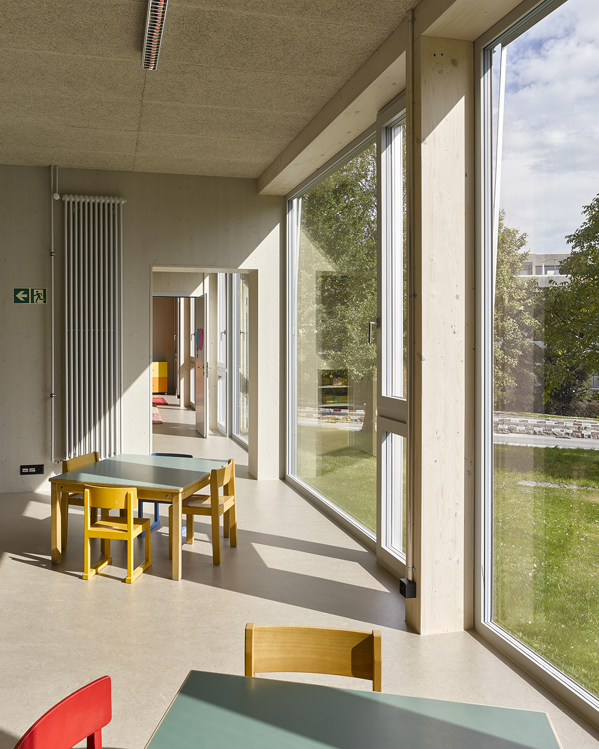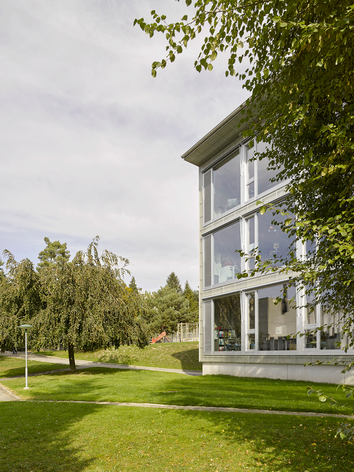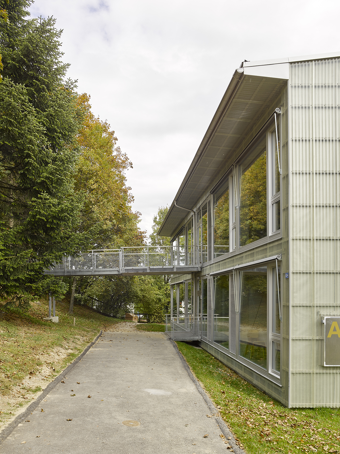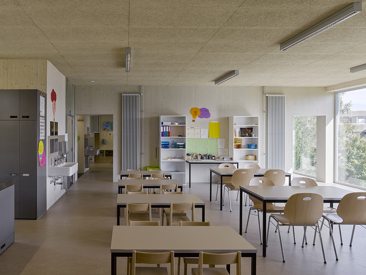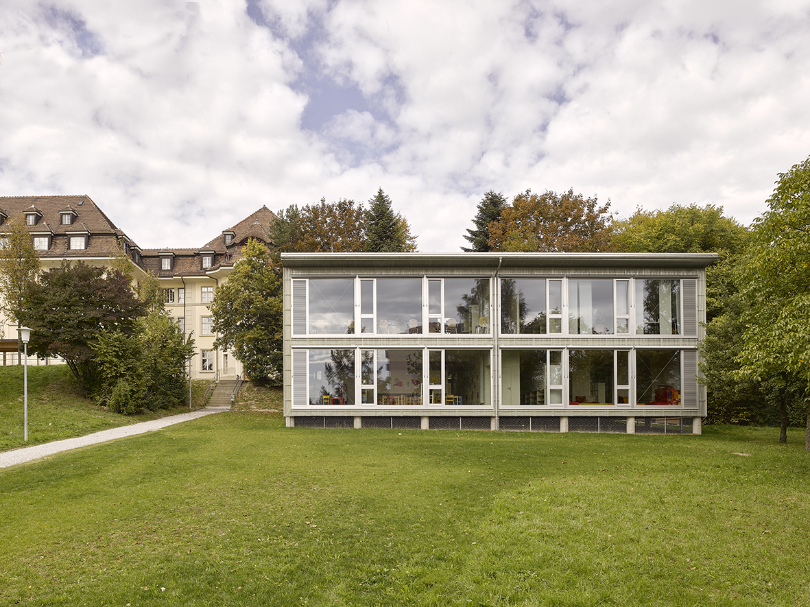 Les pavillons scolaires et d’accueil extra-scolaire sont développés à partir de modules carrés adaptables. Ces éléments sont répliqués en longueur et en hauteur pour s’élever facilement jusqu’à trois niveaux. La simplicité du système et la neutralité des espaces se prêtent avec justesse à des contextes et à des programmes variés. Quatre écoles en ville de Fribourg ont déjà adopté ce type de pavillons. Même s’ils pourraient être éphémères, les volumes sont en effet conçus pour être démontables et ré-affectables, ils offrent aux utilisateurs des espaces généreux bénéficiant d’une belle luminosité et d’une grande qualité.