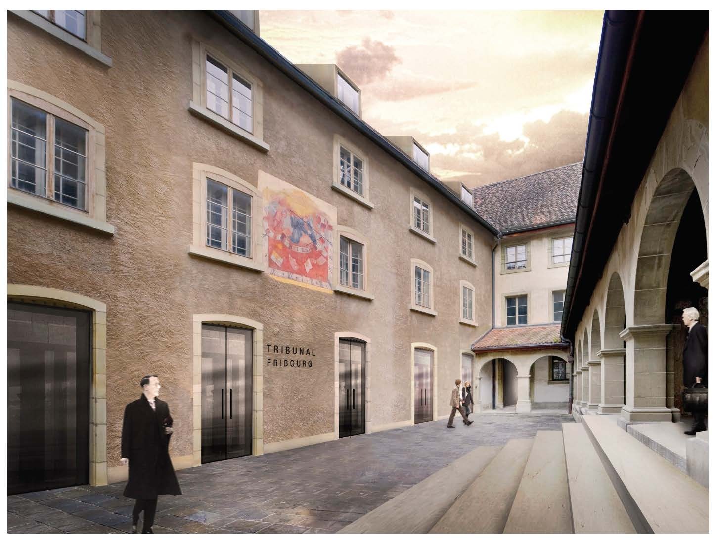 L'ancien Couvent des Augustins à Fribourg est réaffecté en Tribunal Cantonal. En s'insérant dans les séquences d'espaces urbains du quartier de l'Auge, l'ancien cloître devient un lieu accessible au public. Différents cheminements mènent à ce nouvel espace de référence où se situe l'entrée principale du tribunal. A l'intérieur la logique spatiale du déambulatoire du cloître est maintenue et enrichie par la création de zones de dégagement s'ouvrant vers l'extérieur.