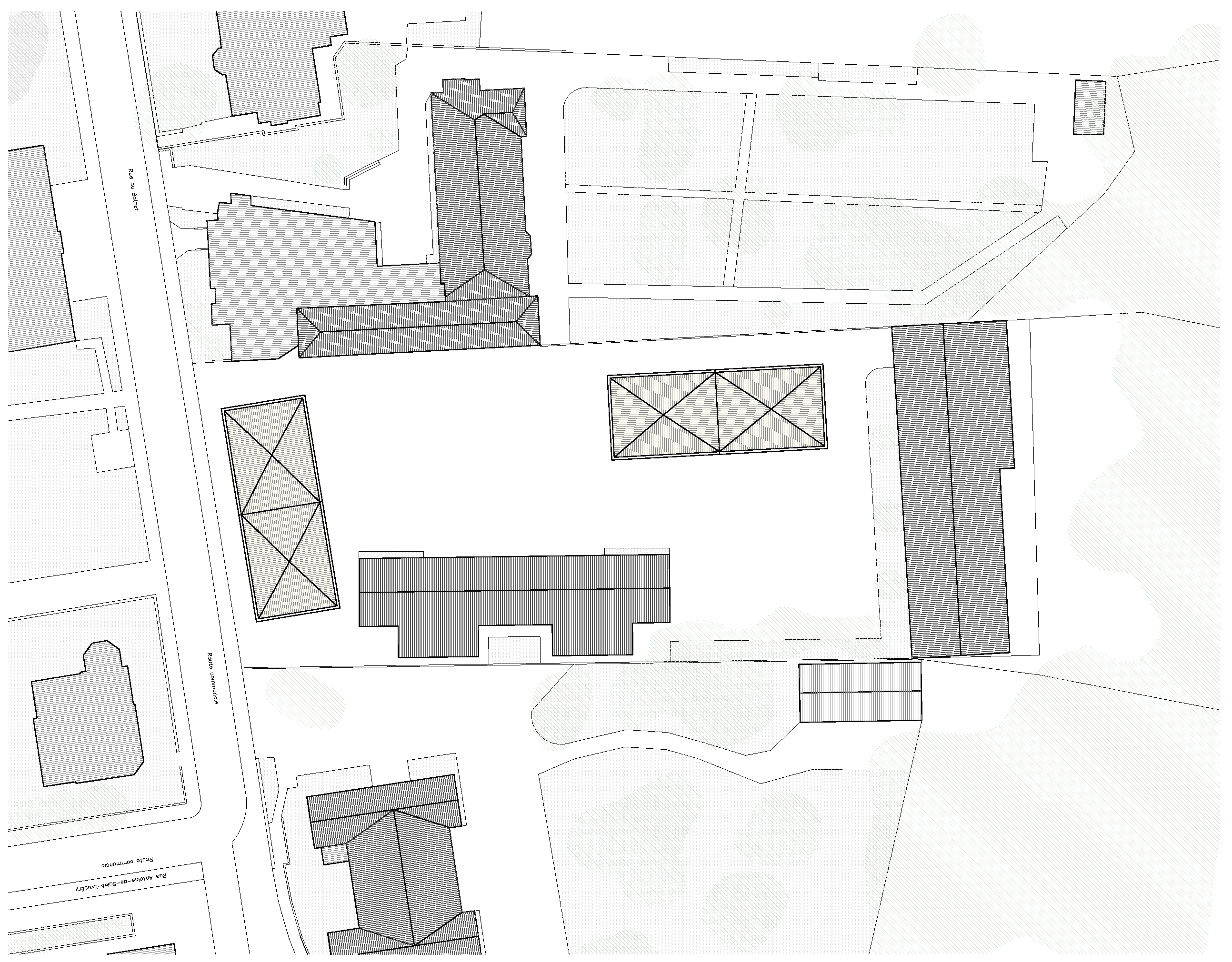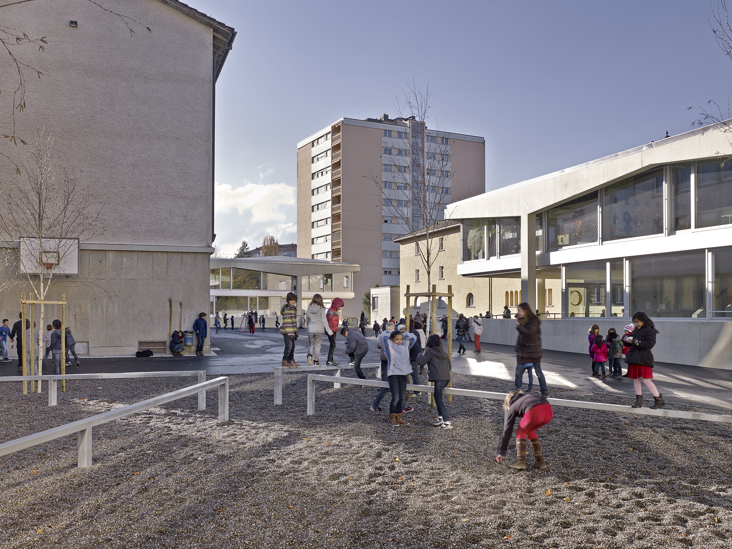 La situation préalable au projet avec deux bâtiments définissait un espace extérieur généreux et intime, légèrement surélevé et retiré depuis la rue. Les deux nouveaux volumes se positionnent l’un par rapport à l’autre et cadrent le préau de manière équilibré. L’agrandissement de l’école apporte une solution en respect de la situation antérieure, sans la détruire, au contraire, l’enrichi et la renforce. La nouvelle intervention propose une réorganisation et une précision de l’espace extérieur tout en maintenant l’importance des volumes existants. Elle se limite en hauteur et crée un niveau de référence cherchant plutôt une ligne horizontale depuis laquelle s’élève l’ancienne partie. Sans toucher les volumes actuels, les deux nouvelles constructions pavillonnaires subdivisent le préau définissant deux places. Elles sont à la fois tenues par un ancien volume et par un nouveau, ainsi que par le bâtiment voisin pour la première place et un mur délimitant la parcelle à l’est pour la deuxième. Ce positionnement souligne la morphologie du lieu et du quartier dans laquelle les bâtiments solitaires composent le vide et se tiennent en balance.