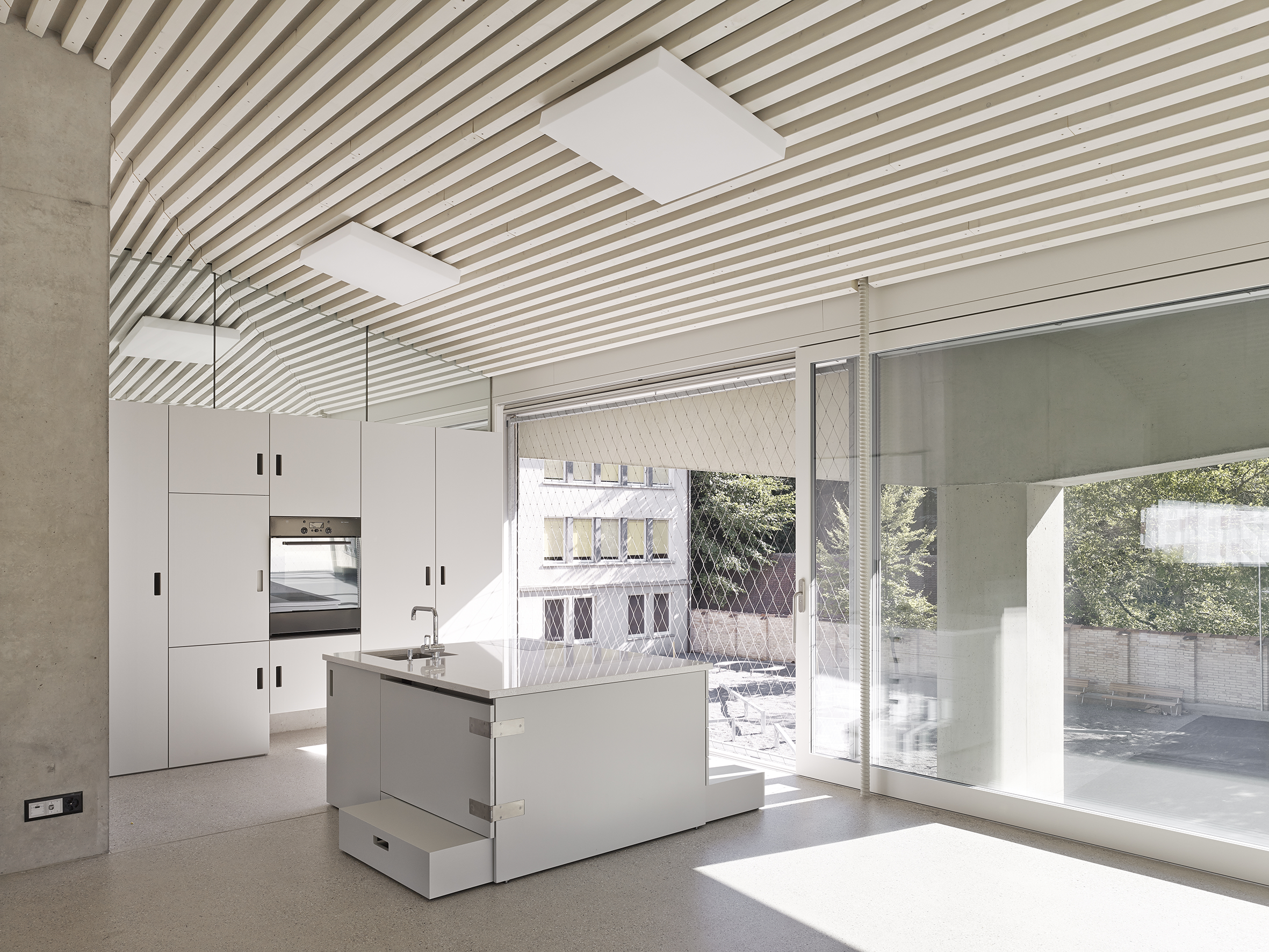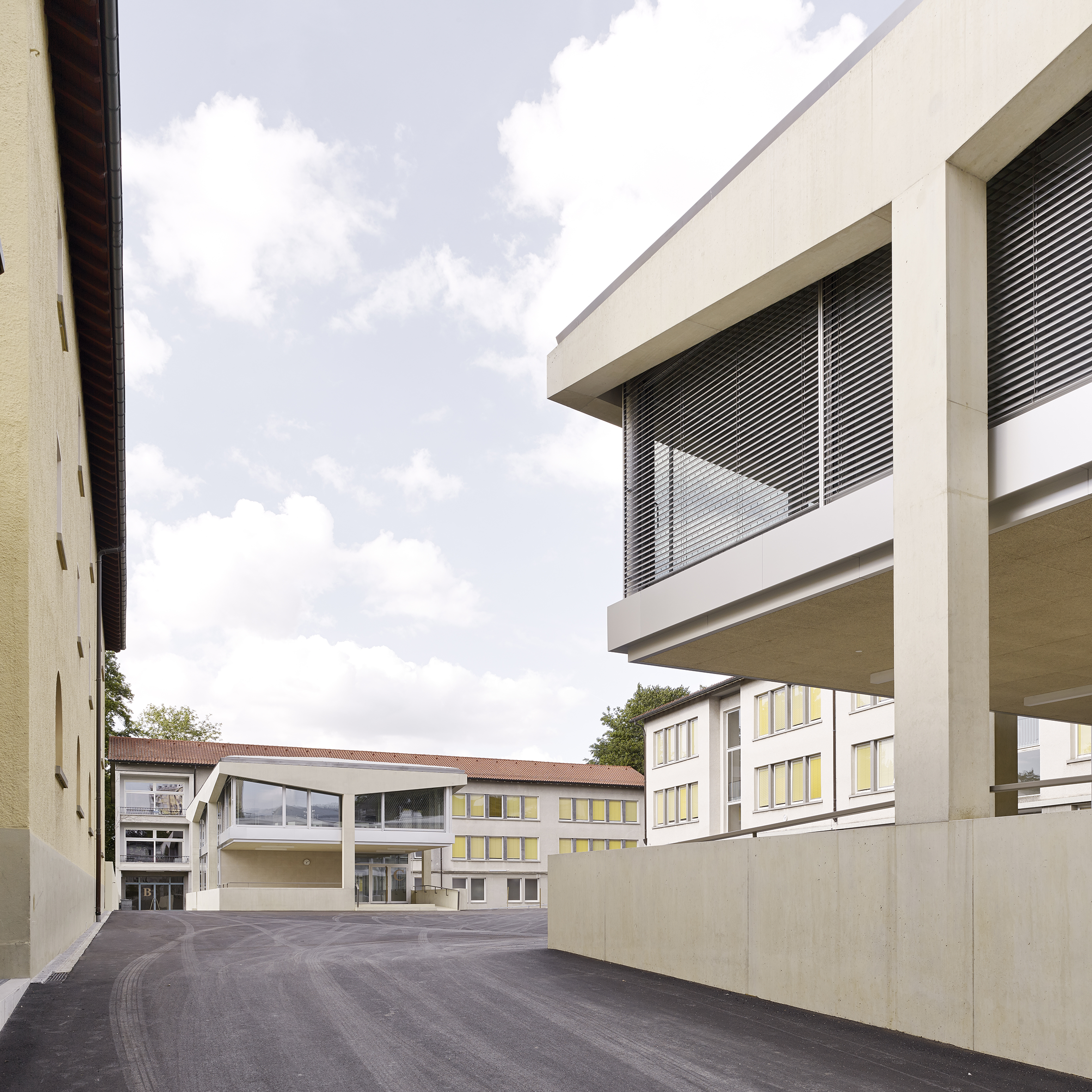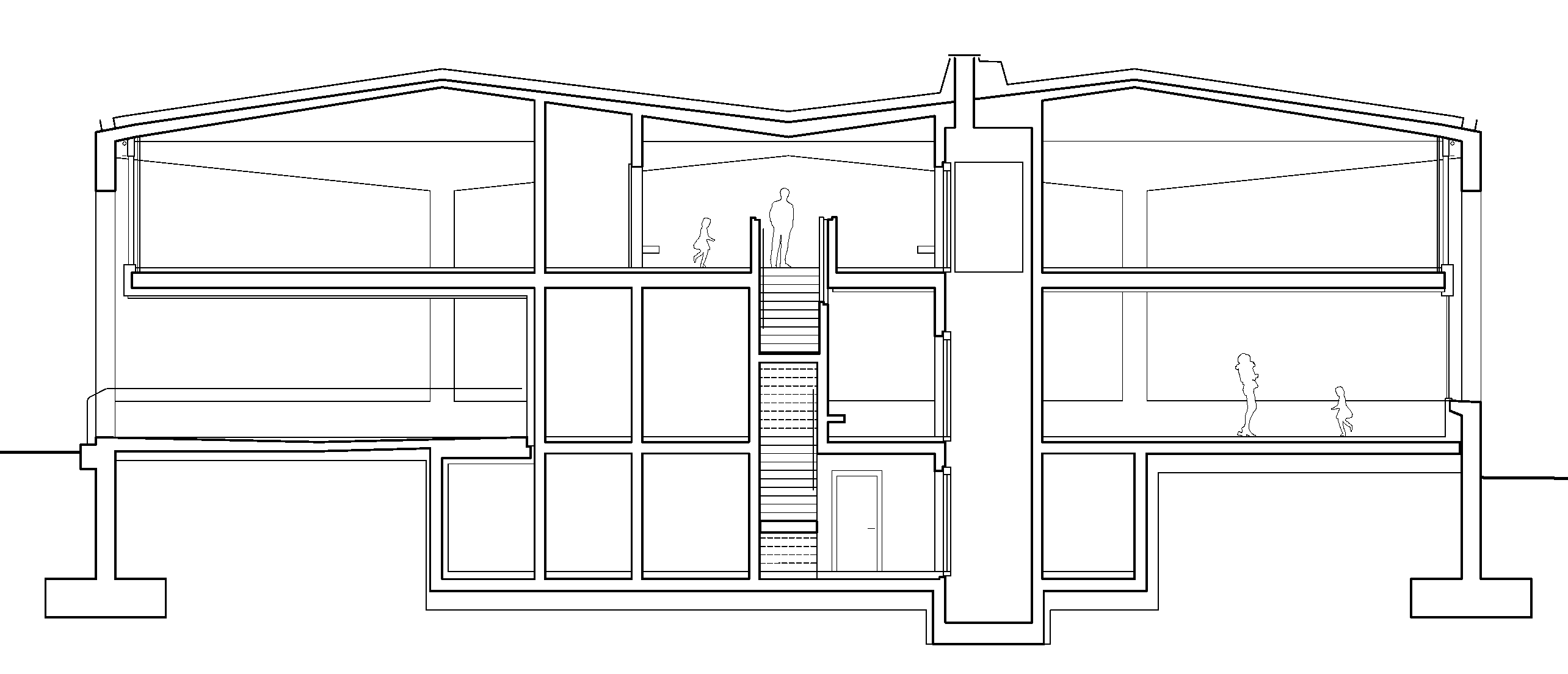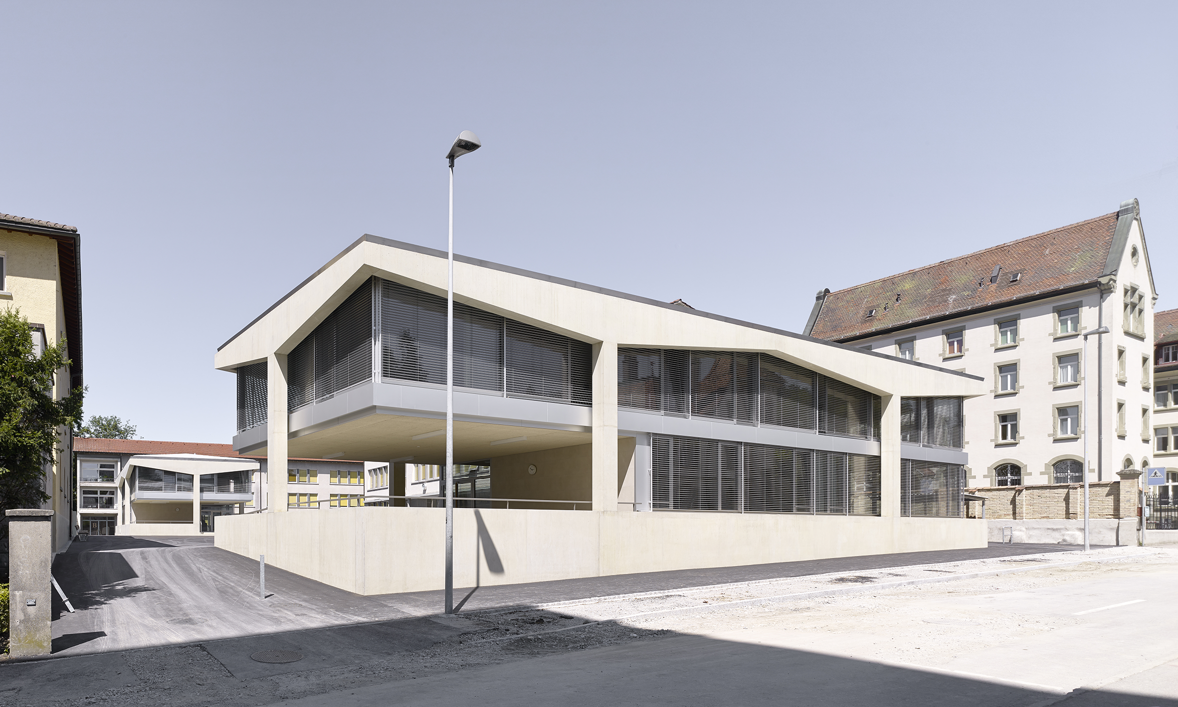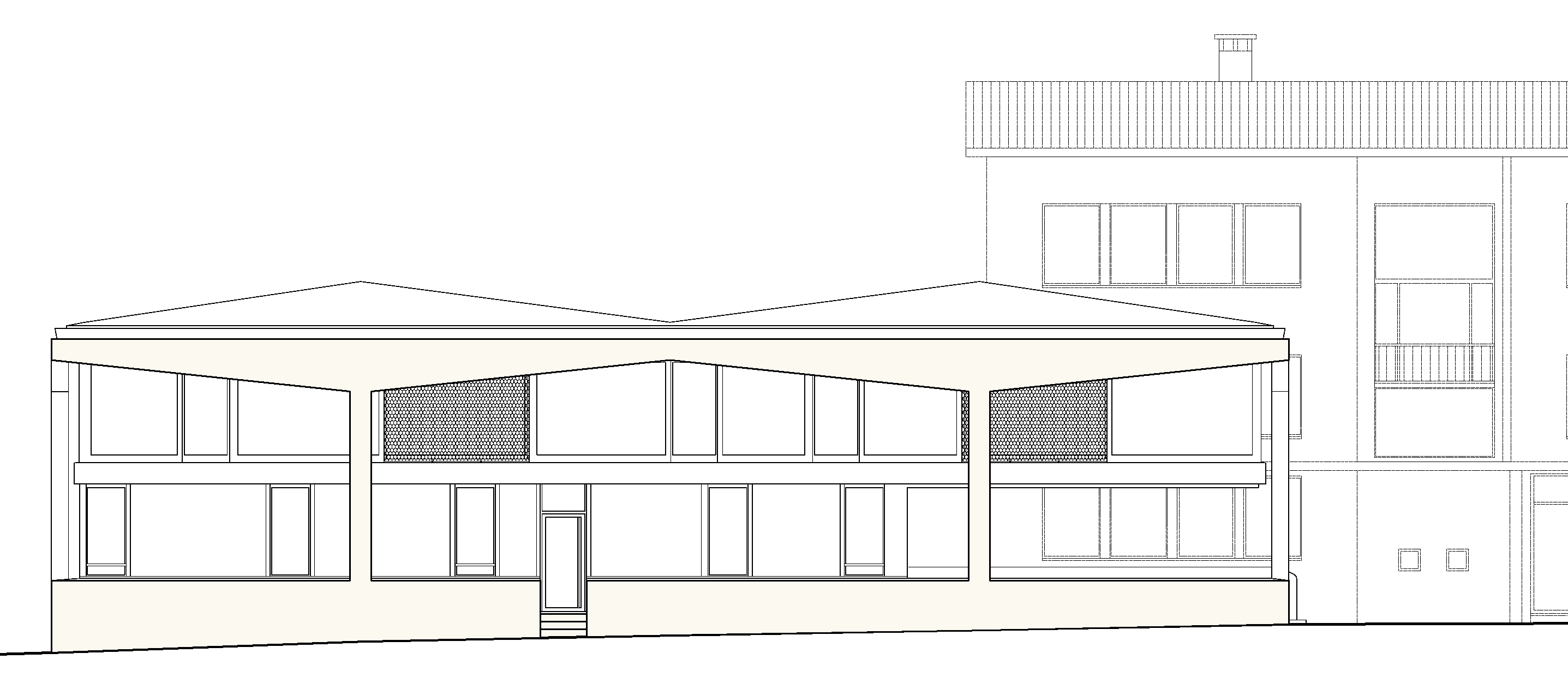 A l’image d’un pavillon les deux nouveaux bâtiments sont disposés et organisés de manière simple, avec une orientation facile pour les utilisateurs et une illumination généreuse. Les constructions sur deux niveaux (et un sous-sol minimal) tiennent les salles de classe de part et d’autre, accessibles depuis le foyer central. Au rez-de-chaussée un parvis couvert accueille les enfants et offre un espace extérieur abrité.