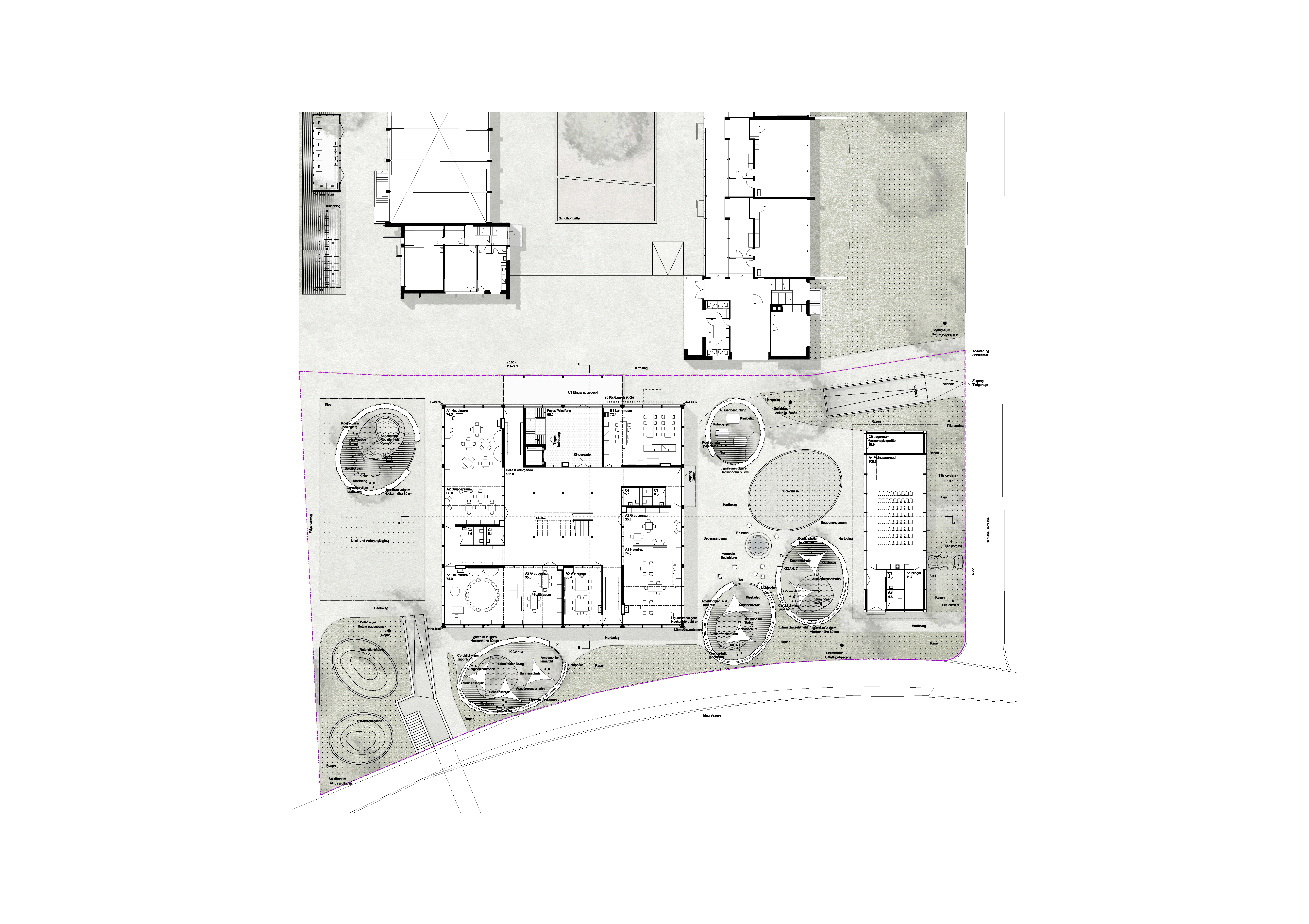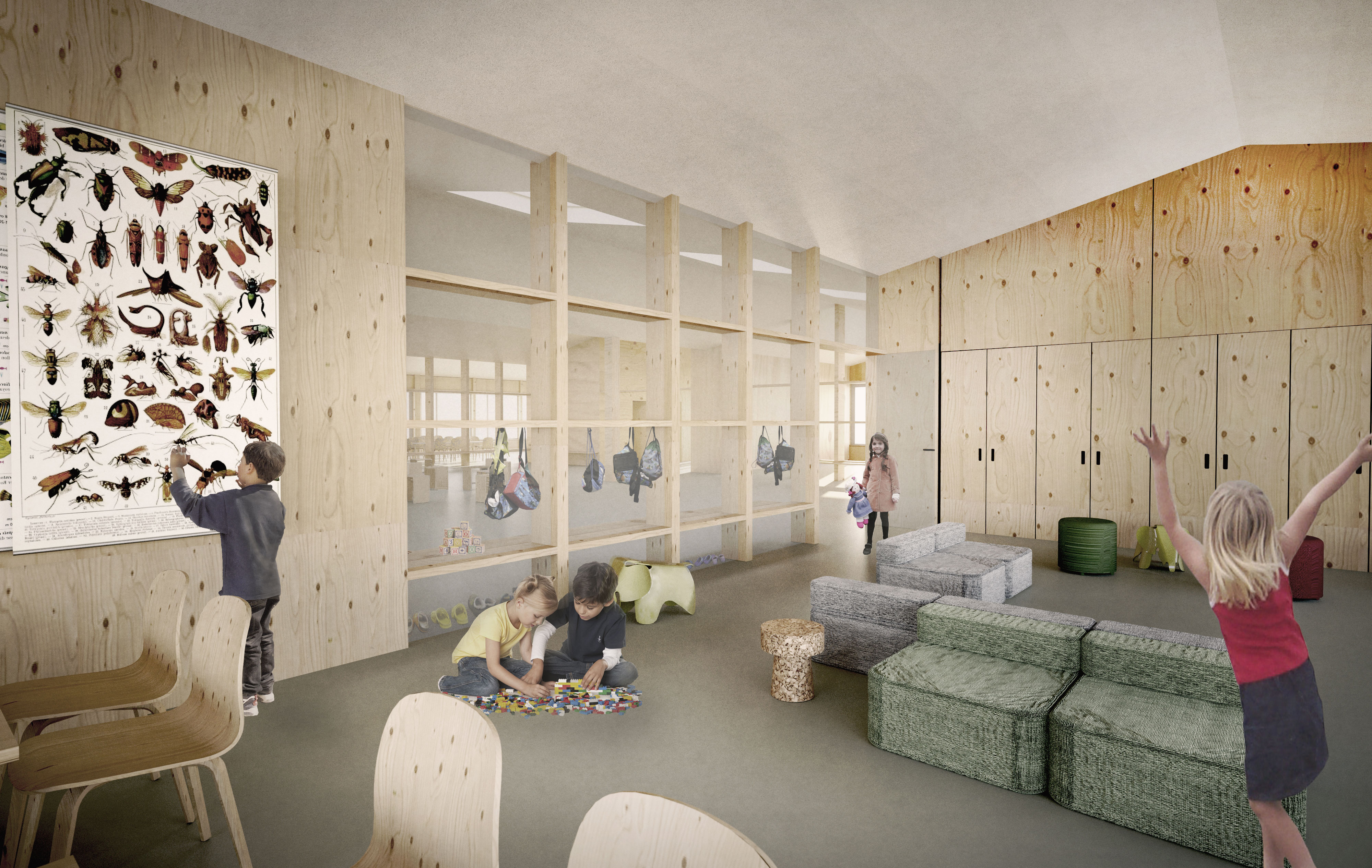 Der Neubau versteht sich als städtebaulich abschliessendes Element der bestehenden Schulanlage. Als weiterer Solitär stärkt der neue Gebäudekörper die Anlage mit den zueinander versetzten Gebäuden und Freiräumen, und fasst den heute dreiseitig umschlossenen Pausenhof. Durch seine Position entstehen innerhalb der schachbrett-artigen Anlage zwei neue Aussenräume mit unterschiedlichen Charakteren, einerseits ein neuer Schulplatz, welcher den Zugang zum Schulareal, aber auch zum Zwickyareal ermöglicht, andererseits ein gefasster und intimer Kinder-Garten. Der ausgelagerte Mehrzwecksaal steht als Pavillon im Grünen und bietet seinen Benutzern eine zusätzliche Raumqualität. Der sehr kompakte Baukörper erlaubt im Innenraum einen übersichtlichen Grundriss mit vielseitigen Durchblicken und grosszügigen Raumproportionen. Im Windmühlenprinzip umschliessen die Unterrichts- und Nebenräume eine zentrale Halle, welche als Schul- und Spielbereich, ja sogar als Mehrzwecksaal genutzt werden könnte. In den beiden Kindergartengeschossen wird die Halle durch eine grosszügige Öffnung räumlich verbunden. Die peripher angeordneten Garderobenbereiche verbinden die Halle direkt mit der Fassade und erschliessen jeweils die Haupträume. So wird die Zahl der Kinder über die Raumdisposition reduziert, die WC Räume bestmöglich an die Klassenräume angebunden. Das ebenfalls an der Fassade angeordnete Treppenhaus dient vor allem der Erschliessung der Tagesbetreuung im letzten Geschoss, regelt durch entsprechende Abschlüsse aber auch den Brandschutz des ganzen Gebäudes und befreit die zentralen Hallen von jeglichen Massnahmen. Das Material Holz erfüllt die Ansprüche an eine dauerhafte und ökologische Lösung, an eine nutzungsneutrale Grundstruktur, sowie an eine robuste und haptisch angenehme Oberfläche. Durch ein klares Brandschutzkonzept können sowohl die Struktur als auch die inneren und äusseren Verkleidungen in diesem versatilen Material gehalten werden. Eine mehrheitlich auf Stützen aufgelöste Struktur unterstreicht die Qualitäten der Grundrisstypologie und filtert das Licht bis in die zentrale Halle. Das kompakte Faltdach nimmt die Firstrichtung der bestehenden Anlage auf, schliesst das Gebäude ab und verleiht der Tagesbetreuung räumliche Besonderheiten. Als zusätzliches Volumen mit der geforderten Überhöhe schliesst der Mehrzwecksaal die Anlage zur Nachbarschaft ab und bietet der gesamten Schule und der Gemeinde einen neuen Begegnungsraum.